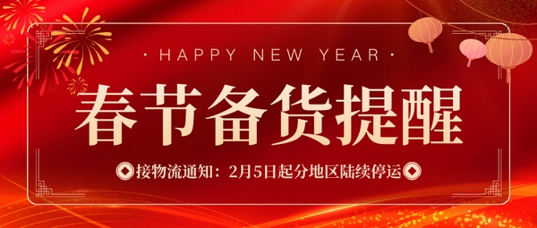 您好!新春將至,謹(jǐn)代表我司全體同仁,預(yù)祝您新春愉快、萬事順?biāo)臁?br />感謝您長期以來的支持與信任,F(xiàn)有一則關(guān)于春節(jié)物流安排的重要通知,敬請您知悉,以便提前做好生產(chǎn)安排。