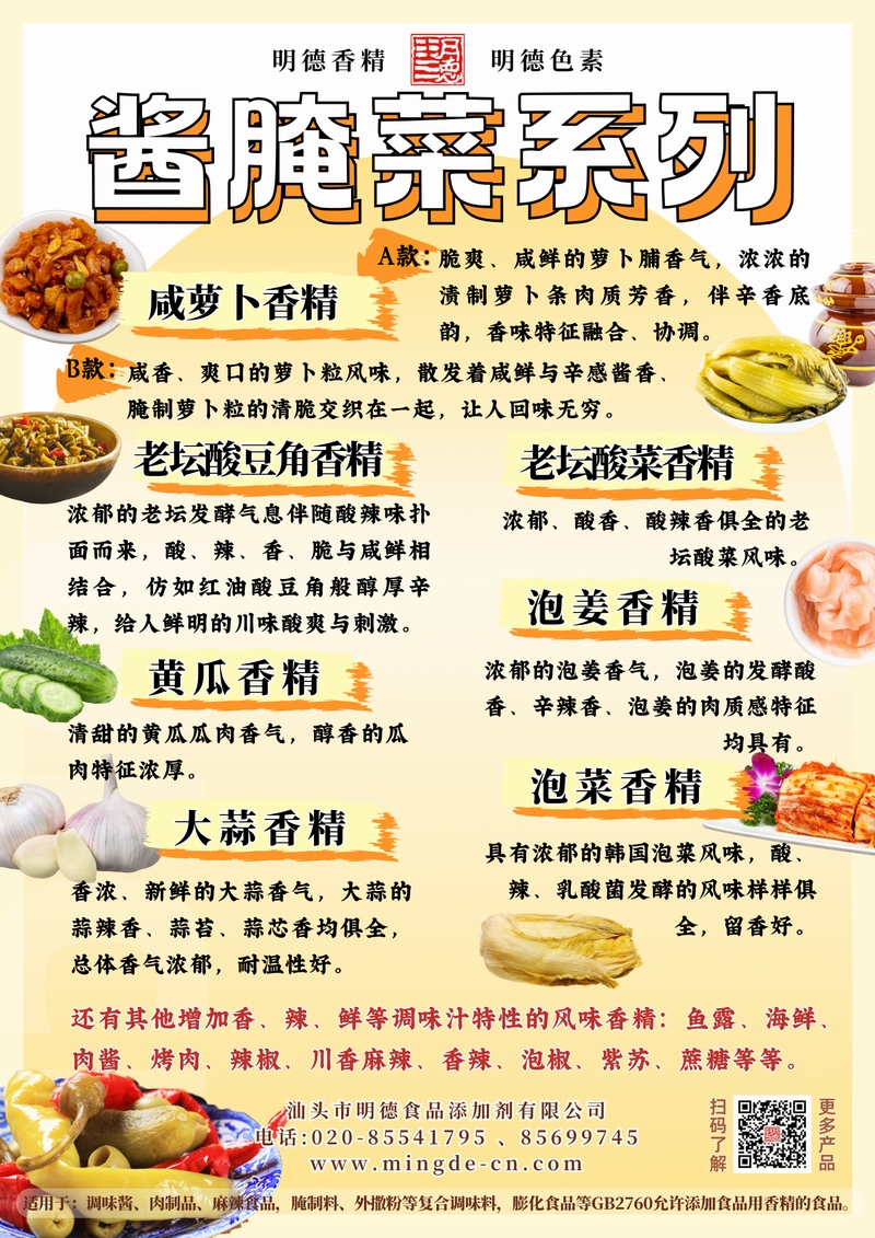汕頭市明德食品添加劑有限公司的醬腌菜系列香精,涵蓋咸蘿卜、老壇酸豆角、老壇酸菜、黃瓜、泡姜、泡菜、大蒜等多種品類(lèi)。香氣真實(shí)、留香穩定,適用于鹵味熟食、腌制菜肴、復合調味料、調味醬、速食及方便食品等B端應用,幫助工廠(chǎng)打造具有地道風(fēng)味特征的產(chǎn)品。